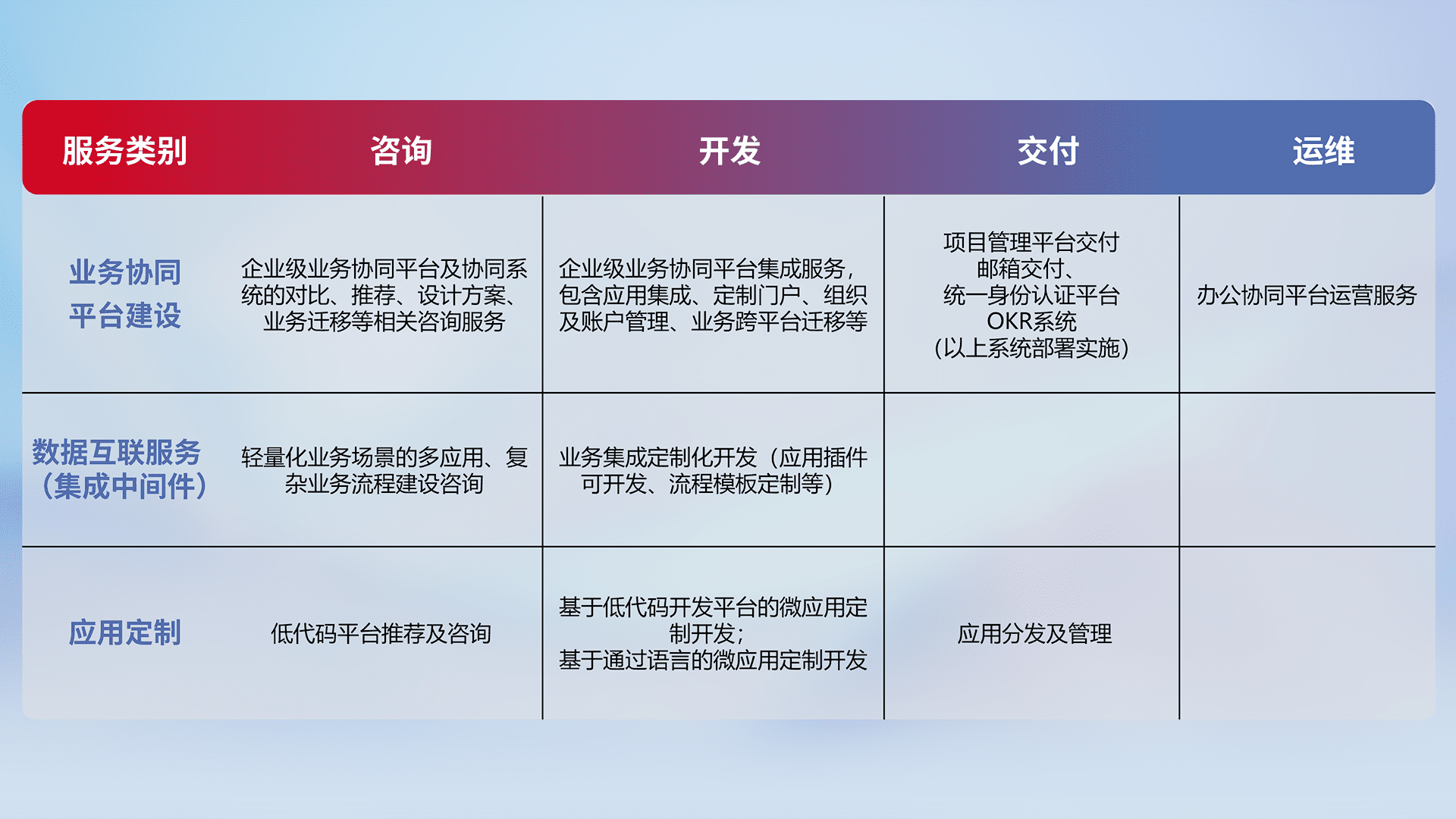 针对钉钉、、、企微、、IDaas等平台级产品提供产品的规划、、方案、、交付、、定制化开发等服务,,,实现如统一协同办公、、、、智能客户服务、、、混合会议管理、、、智能数据查询、、、、等业务场景,,实现数字化转型。。。。